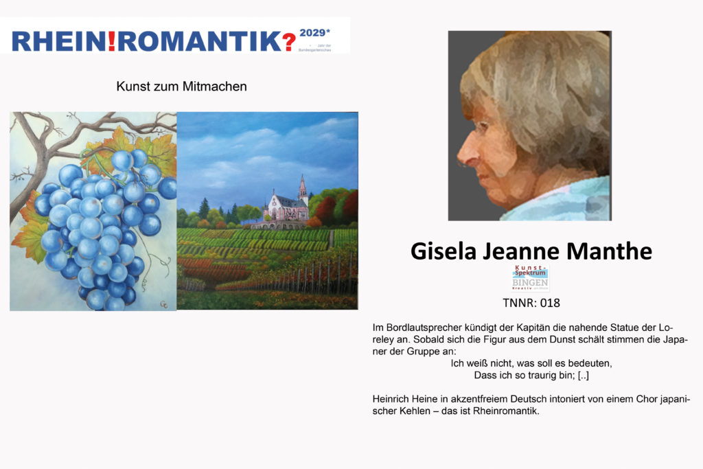 Als Malerin, die seit vielen Jahren am Rhein lebt, sehe ich die Rheinromantik nicht als abgeschlossene Epoche, sondern als offenen Raum der Empfindung. Das ! steht für das Staunen, für die starke emotionale Kraft, die der Rhein in mir immer noch auslöst – in Licht, Bewegung, Geschichte und Natur. Das ? dagegen lässt mich fragen: Was ist geblieben von der Idee der Romantik? Ist sie heute nur noch ein Bild im Kopf – oder lebt sie weiter in unseren Blicken, in der Kunst, im Alltag?