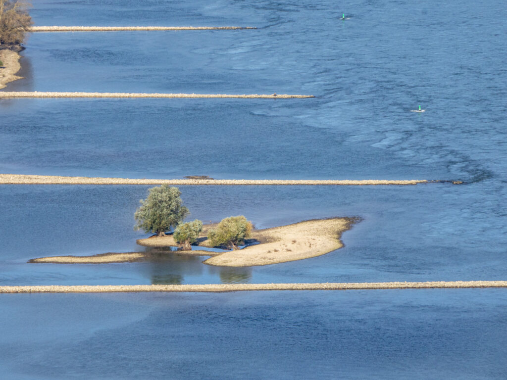 Wenn der Rhein dir Raum lässt, kannst du dich in deiner ganzen Schönheit entfalten: Deine Bäume spiegeln sich in den Wellen, und auf den Muschelbänken staksen Vögel umher. Die Buhnen halten die Wucht des Wassers ab und schenken dir eine Atempause.