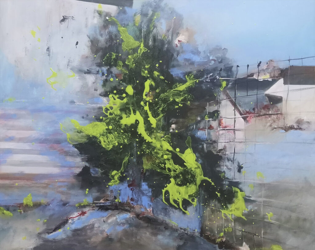 Landschaft in geometrische Formen gefasst, Kanten und Winkel perspektivisch angewandt. Ordnung im Spiel der Willkür.