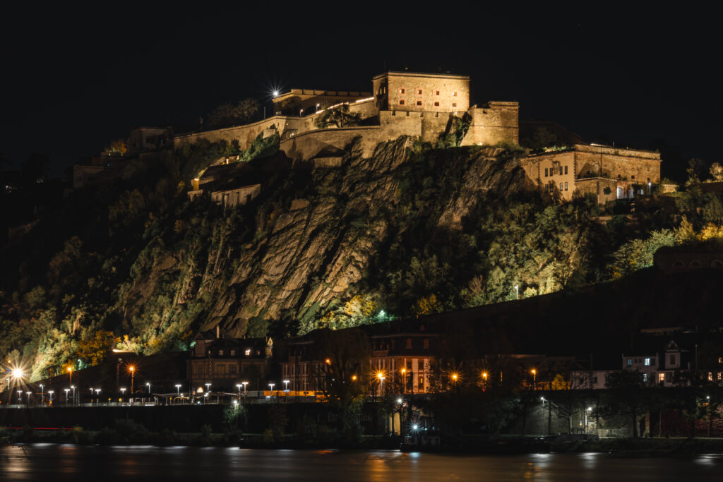 Es ist ein Glanz die Nacht durchdringend. Lichterspiel im Spiegel des Wassers, Felsspalten auffaltend in schroffes Gestein und im Schein der Lampen die Festung am Rhein.