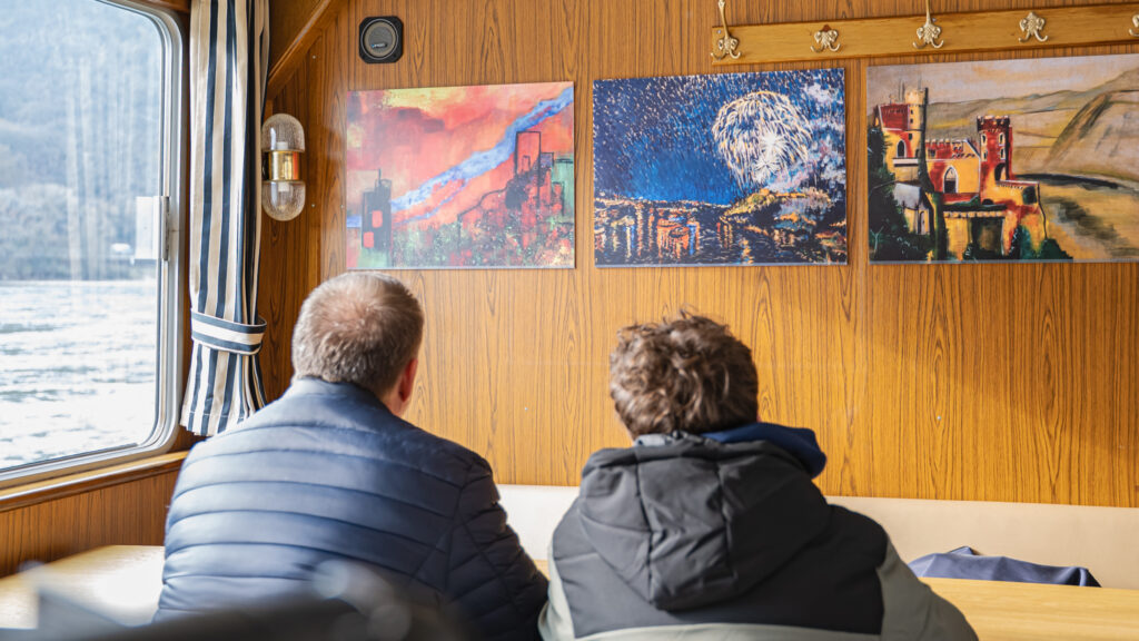Mit dem Ende des Nachmittags beginnt die eigentliche Reise der Bilder: Während der langen Linienfahrten treten die Motive der Ausstellung in Erscheinung – wie auf einer sich wandelnden Bühne entlang des Rheins. Sie begleiten die Gäste, lassen Wirklichkeit und künstlerische Deutung aufeinandertreffen und öffnen Raum für eigene Vorstellungen und innere Bilder.