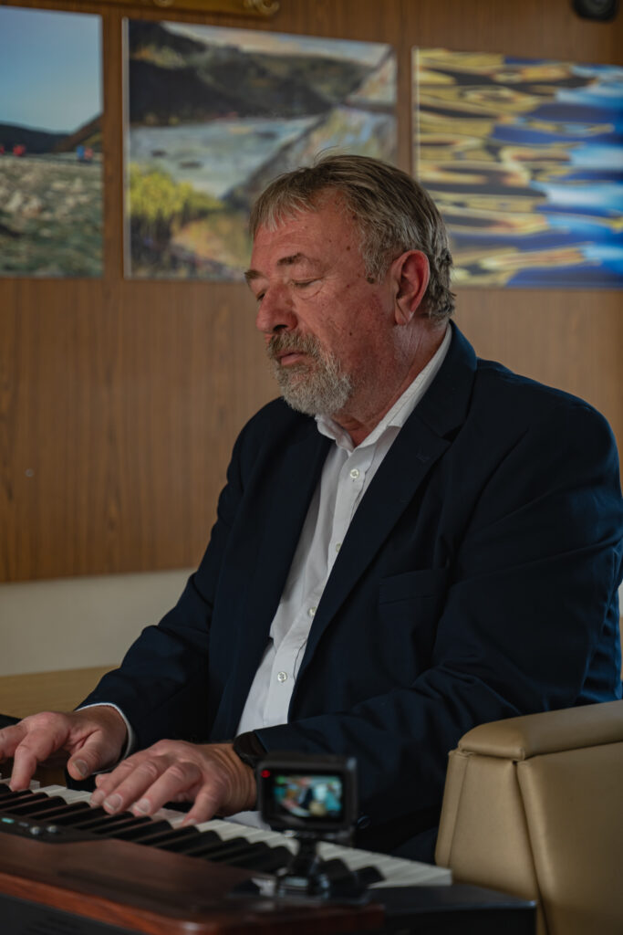 Musikalisch wurde die Veranstaltung von Harald Mebus gestaltet. In Improvisationen über „Ich weiß nicht, was soll es bedeuten“, „Stück ohne Namen“ sowie über Bachs „Air“ griff er diese Gedanken auf und übersetzte sie in eine eigene klangliche Form.