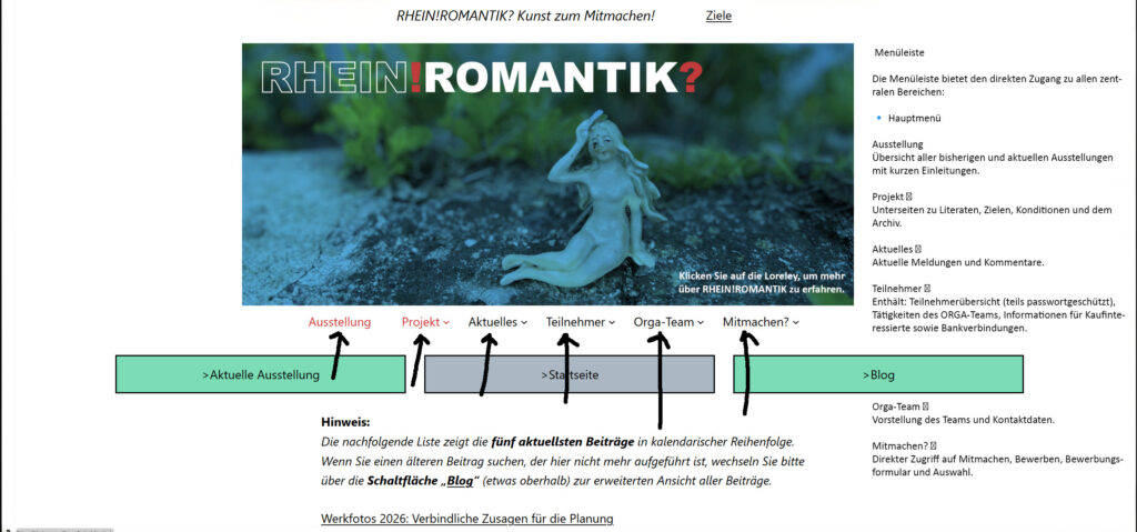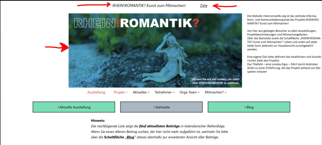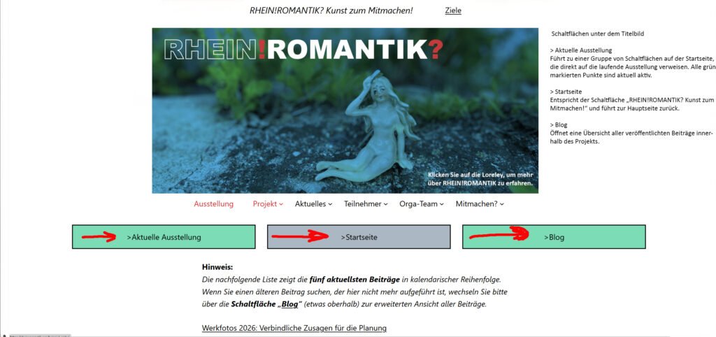 Über die Startseite sowie die Schaltfläche „RHEIN!ROMANTIK? Kunst zum Mitmachen!“ (oben und unten auf jeder Seite) kann jederzeit zur Hauptansicht zurückgekehrt werden.
