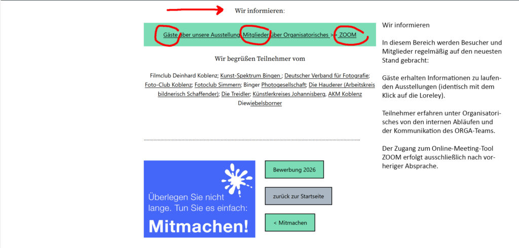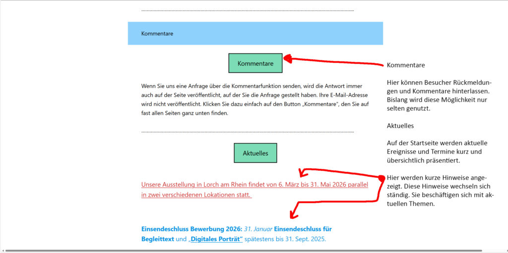 Unseren Gästen empfehlen wir die Starseite nicht das Menü von unsere Homepage, dort finden Sie die wichtigsten Informationen. Scrollen Sie einfach ein wenig nach unten und Sie werden über Ihre Bewerbungsmöglichkeiten für 202x informiert und noch ein wenig weiter unten über die aktuelle Ausstellung.