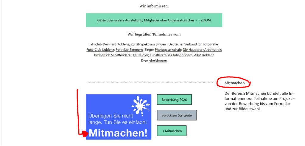 Der Bereich Mitmachen bündelt alle Informationen zur Teilnahme am Projekt – von der Bewerbung bis zum Formular und zur Bildauswahl.