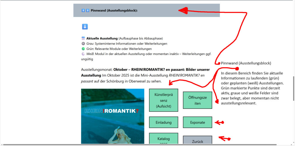 Dieser Bereich bietet zeitnahe Informationen zu laufenden oder geplanten Ausstellungen. Grün markierte Schaltflächen sind derzeit aktiv; graue und weiße Felder sind belegt, aber momentan nicht ausstellungsrelevant.